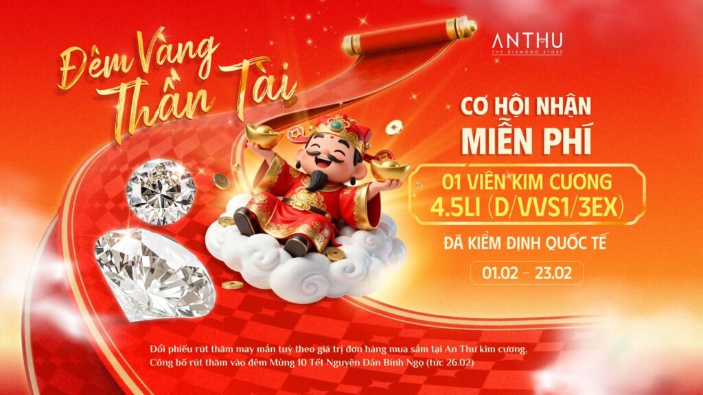 Trong thời gian từ ngày 01.02 đến 23.02.2026, với mỗi giao dịch mua sắm trang sức tại An Thư, Quý khách sẽ nhận được phiếu dự thưởng may mắn, mở ra cơ hội nhận miễn phí 01 viên kim cương 4.5li với thông số xuất sắc: